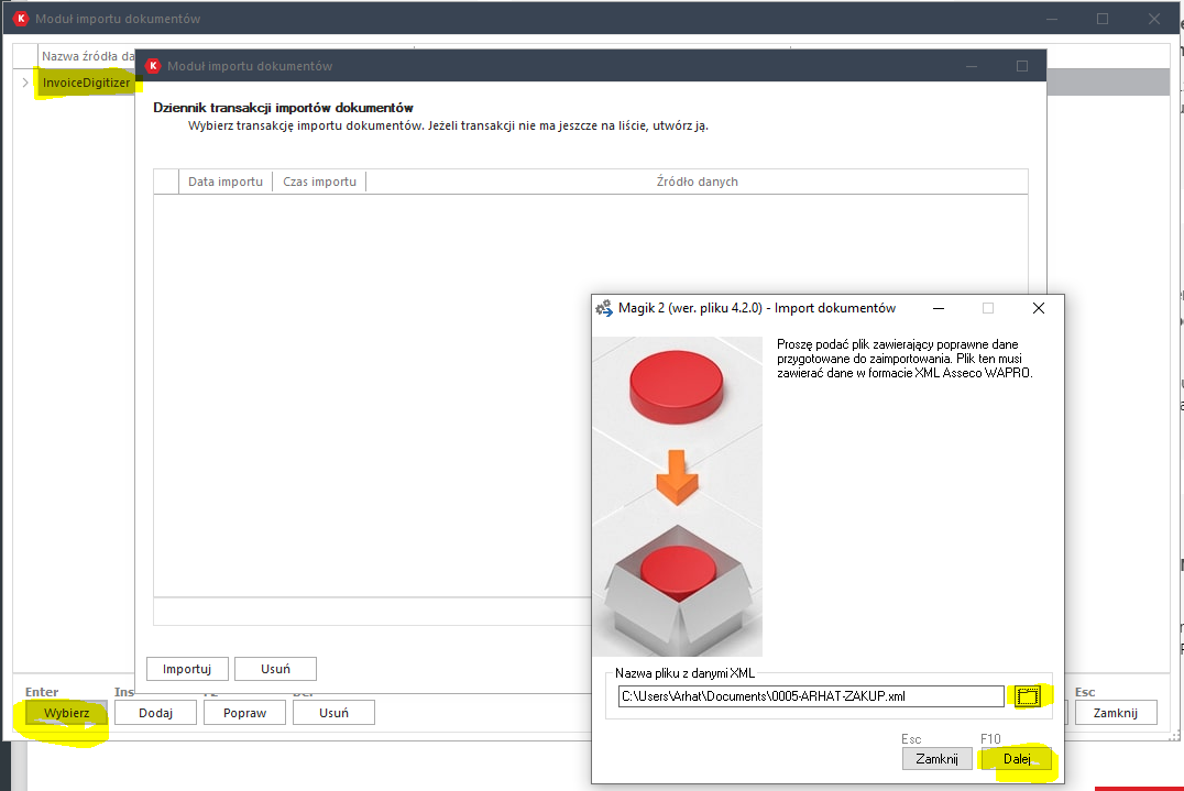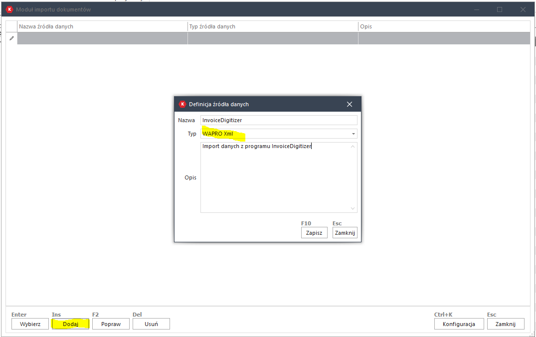 WAPRO - tworzenie definicji źródła danych InvoiceDigitizer.