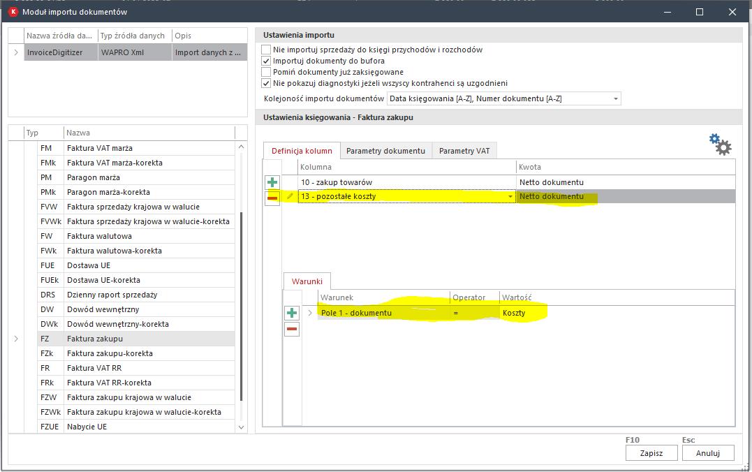 kolumna 13 gdy Pole 1 dokumentu jest równe Koszty
