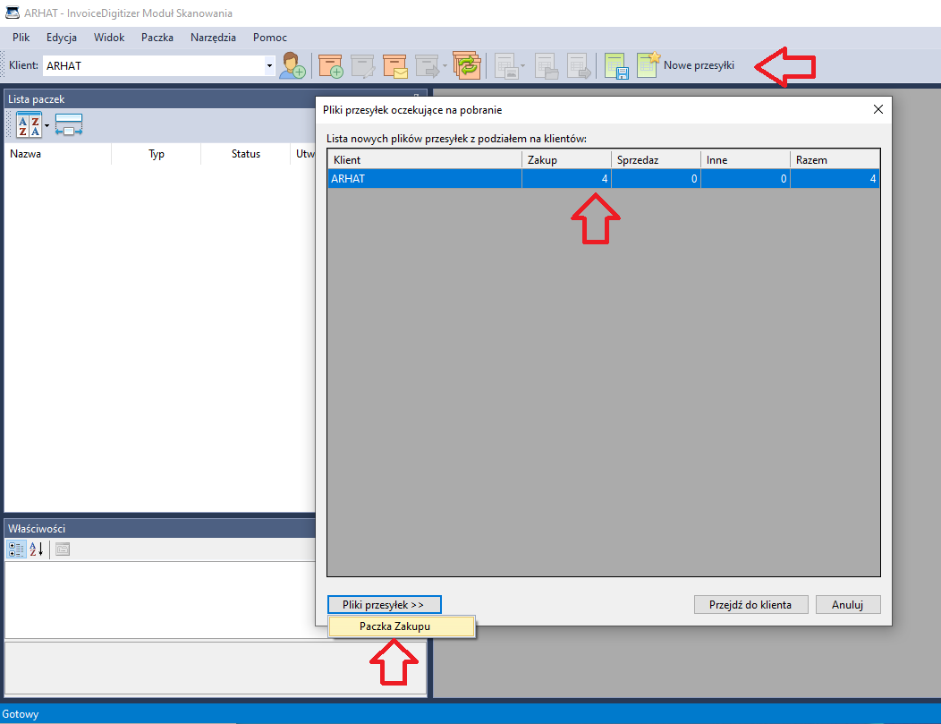 - Utwórz nową paczkę (zakup/sprzedaż) a wskazane dokumenty zostaną automatycznie pobrane i umieszczone w nowoutworzonej paczce.