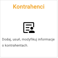 ![]() | Kontrahenci - lista zarejestrowanych kontrahentów. Możesz zarejestrować nowych lub zmienić bądź usunąć dotychczasowych. Serwis GUS i VIES pomogą Ci wprowadzić dane kontrahenta jak tylko znasz ich NIP (NIPUE). |