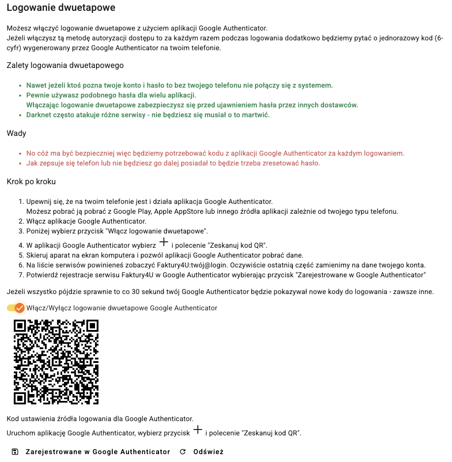 Zachęcamy do włączenia logowania dwu-etapowego z zastosowaniem Google Authenticator. Poniżej znajdziesz rozdział gdzie opisaliśmy całą procedurę jak to włączyć.